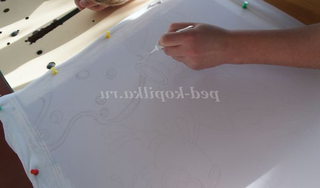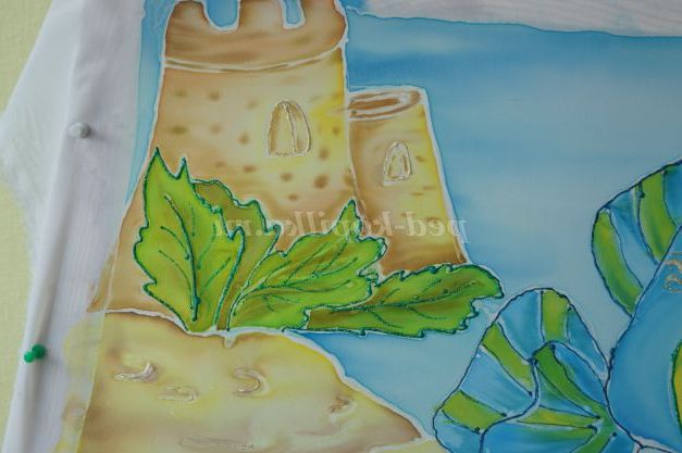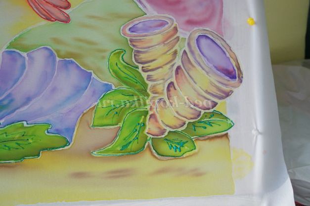 • Розпис елементів виконується з сирої тканини. Фарбу наносимо від самого світлого відтінку до темного, від світла до тіні. Оскільки картина досить велика, то я розмальовувала її окремими елементами.