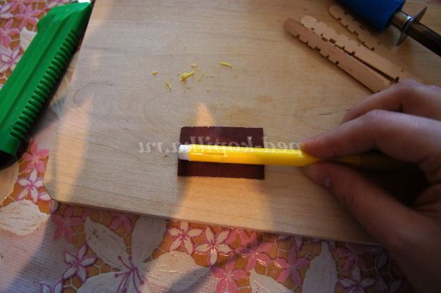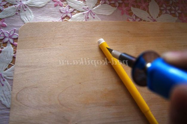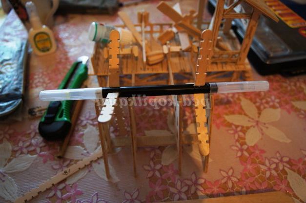 Для виготовлення вала вирішено було взяти корпус від старого фломастера. Випалювачем акуратно відрізаємо непотрібну частину, і робимо прорізи для лопатей (в даному випадку використовувалися дерев'яні рахункові палички), прорізи потрібно обробити наждачним папером.
