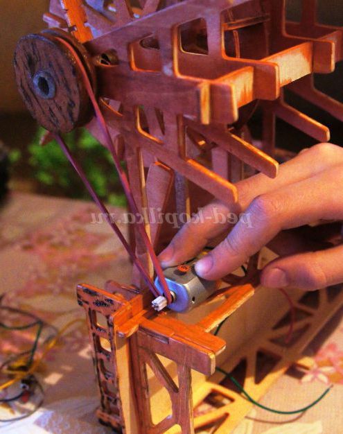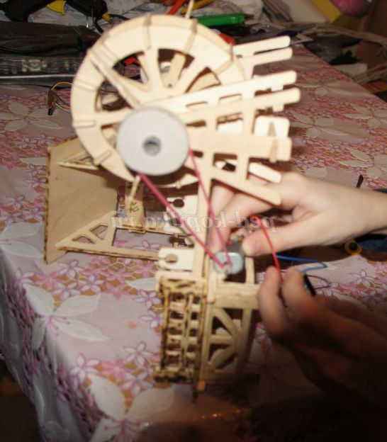 Що б привести в рух колесо - встановлюємо моторчик, батарейку і кнопку включення (всі ці елементи були взяті зі старої іграшки), припаюємо дроти з простої електричної схемою. Крутний момент від моторчика на колесо передається засобом приводного ременя. Перевіряємо роботу млина.