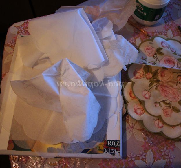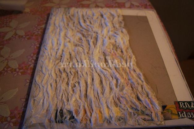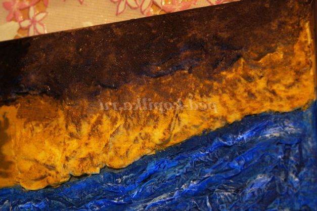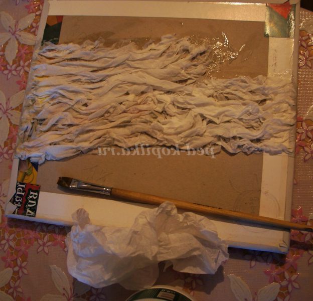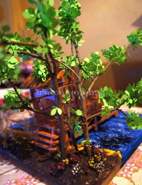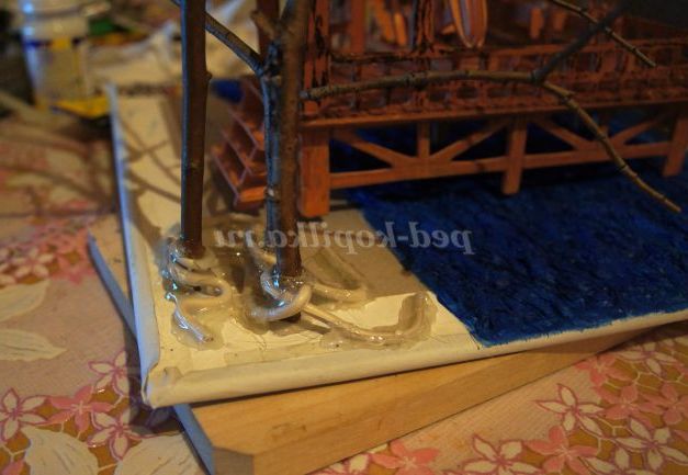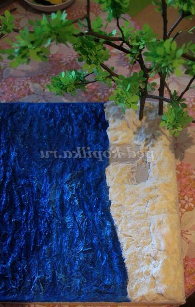 Берег також формуємо з змоченою в клеї серветки, піднімаємо один з країв берега і закриваємо коріння дерев. Поки серветка сира посипаємо берег манною крупою - після фарбування вона буде схожа на пісок і землю. Добре просушуємо і офарблюємо в відтінки жовтого і коричневого.