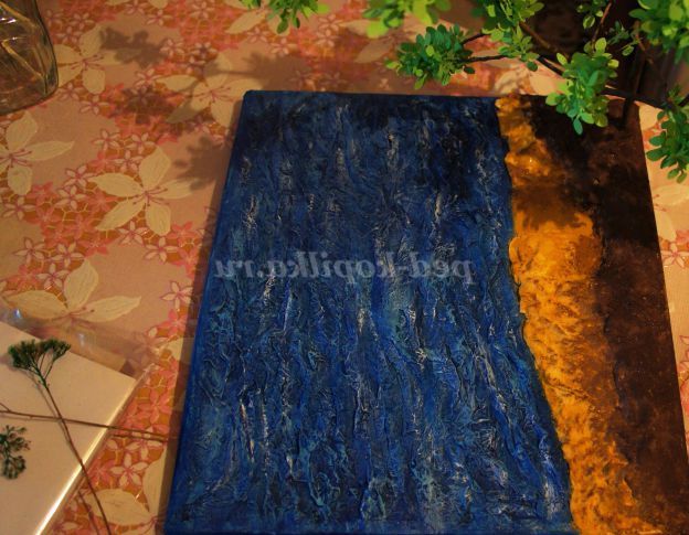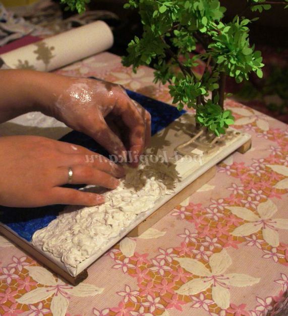 Намічаємо на основі олівцем розташування річки, береги, дерева. Імітація річки створюємо за допомогою серветки і клею ПВА, мнемо серветку, і приклеюємо її клеєм до основи, коли все висохне профарбовуємо синьою фарбою. І через деякий час білою фарбою наносимо відблиски .