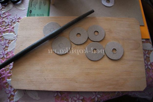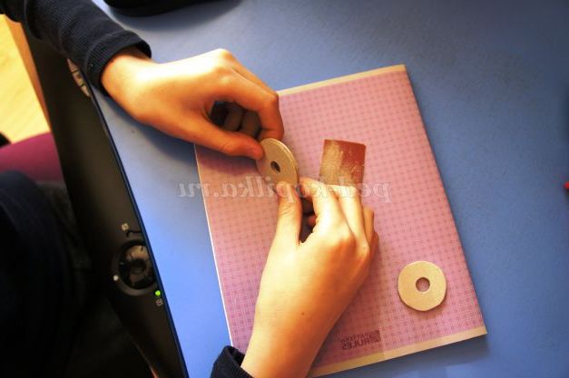 Колесо, в даному випадку шків, зібрано з 6 круглих заготовок - 2 меншого діаметру, і 4 більшого діаметра. Склеюємо їх, зачищаємо наждачним папером. Закріплюємо шків на торці вала.