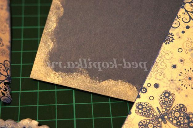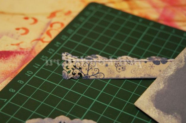 Зі скрап паперу вирізаємо прямокутник зі сторонами 7 х 13см., і невелику смужку (нею ми будемо закривати місце приклеювання стрічки). На смужці фігурним дироколом вирізаємо візерунок.