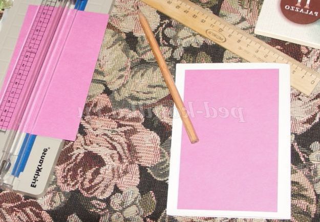 З білого паперу вирізаємо прямокутник 21х15, згинаємо по широкій стороні, отримуємо основу для листівки. З рожевої папери одержуємо прямокутник зі сторонами 10х14.