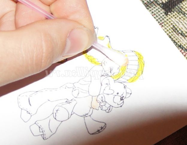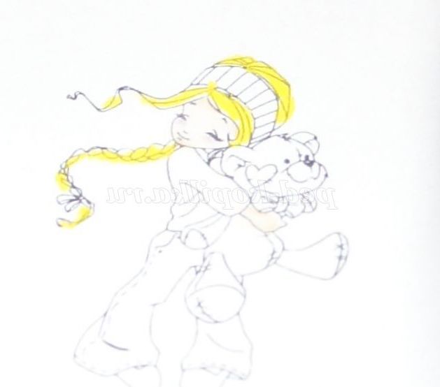 Підтінюємо обличчя і руки олівцем тілесного кольору, додаємо рум'янець (на жаль на фото не дуже видно колір особи і рум'янець на щоках), волосся зробимо жовтенькими. Все акуратно растушуем ватною паличкою.
