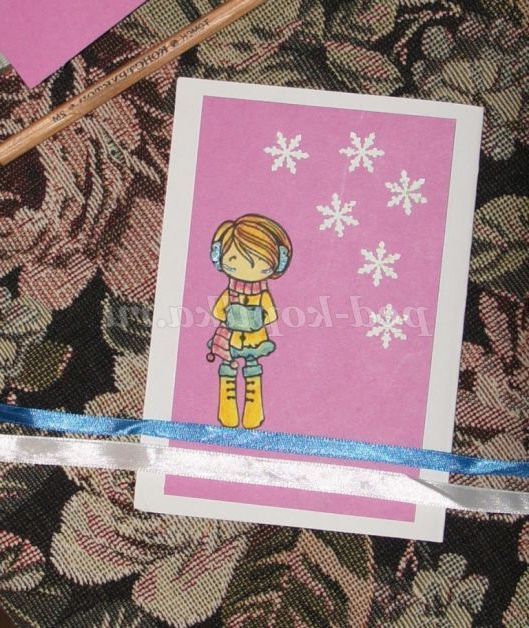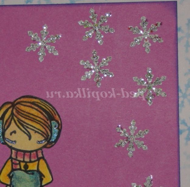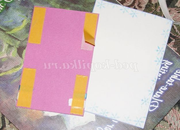 За допомогою фігурного діркопробивача на простому аркуші вирізаємо сніжинки, прикладаємо його на білу листівку і за допомогою штемпельної подушки створюємо легкий фон. Підтінюємо краю листівки і рожевого прямокутника.