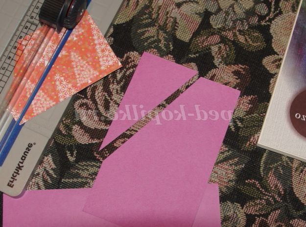 З білого паперу вирізаємо прямокутник 21 х 15, згинаємо по широкій стороні, отримуємо основу для листівки. З рожевої папери та скрап паперу вирізаємо два трикутника зі сторонами 9,5 х 6 х 11,4.
