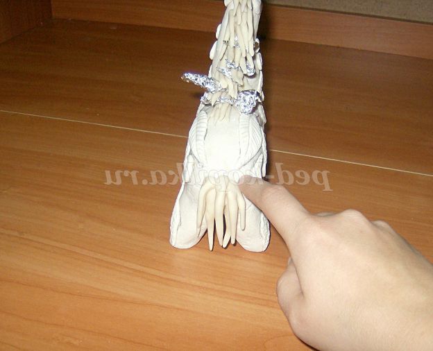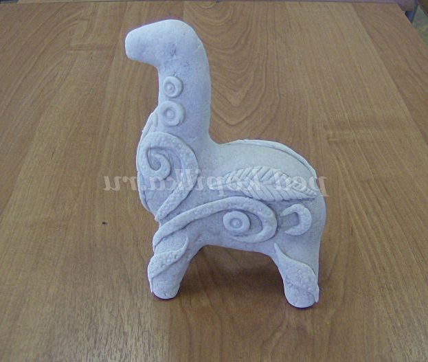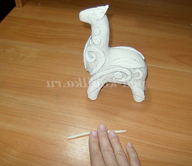 Працюємо з тестом. Нащипываем від шматка тесту невеликі шматочки, трохи розминаємо пальцями і починаємо облепливание фольги (поверхні Коні). Спочатку рівним шаром облепим ноги, потім - голову, шию і все тіло. Таким чином, фольгу «покриваємо» тестом. Основне виріб готовий. Відправляємо його на просушку. Ми поставили його під батарею.