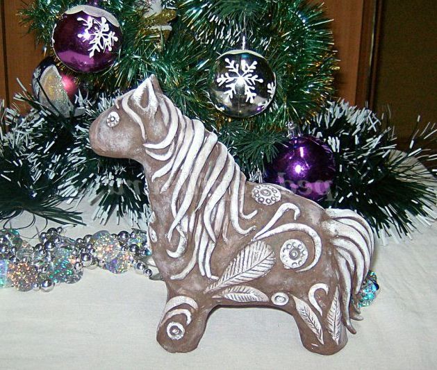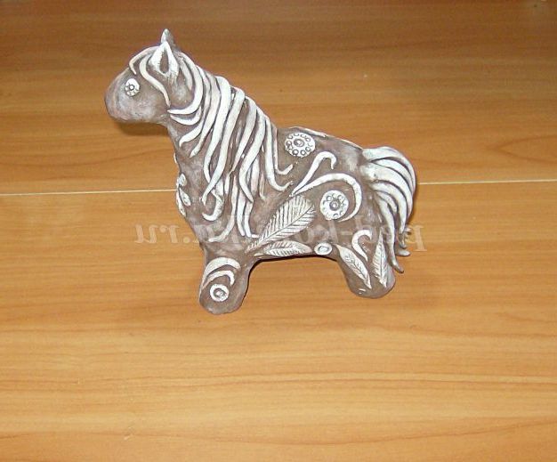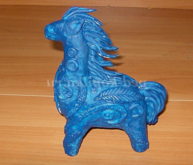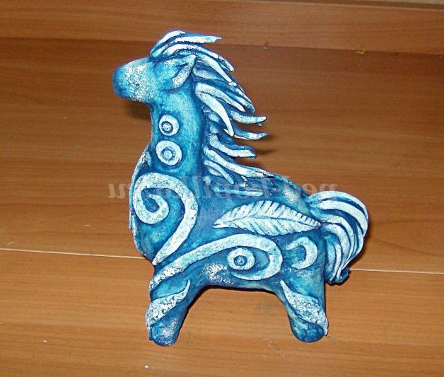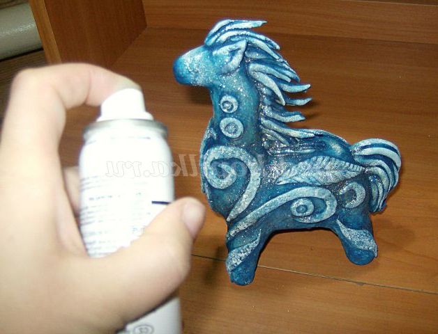 Висохле виріб (через добу) розфарбовуємо синьою тушшю. Не чекаючи повного висихання гуаші, Конячку спочатку витирає губкою, потім - вологою серветкою. Після цього декоруючі елементи злегка пофарбуємо білою гуашшю. Останній штрих: покриваємо наш виріб блискучим лаком для волосся.
