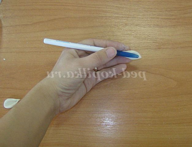 Коли основа вироби висохне (приблизно через добу), приступаємо до декорування. Елементи декору спочатку малюємо простим олівцем на основі. Потім з шматочків тіста (щоб не сохло, беремо з пакету потроху) формуємо потрібні елементи: листочки, кружечки, джгутики. Приклеюємо їх до основного виробу клеєм ПВА. Листочки формуємо з шматочків тіста каплевидної форми, а жилки на них позначаємо за допомогою стеки. Кульки і джгутики придавлюємо кінчиком ручки.
