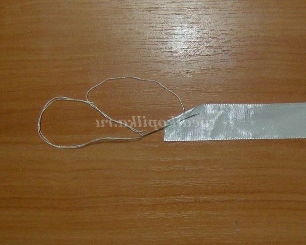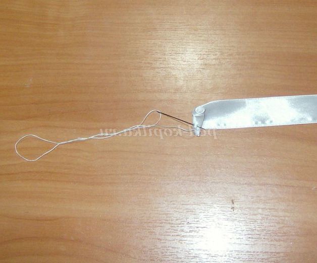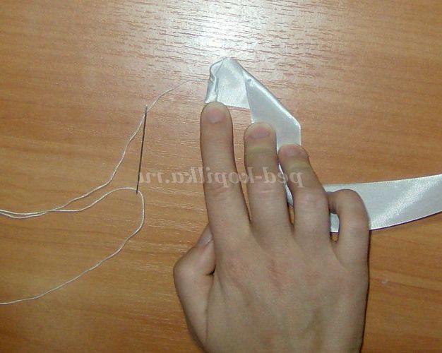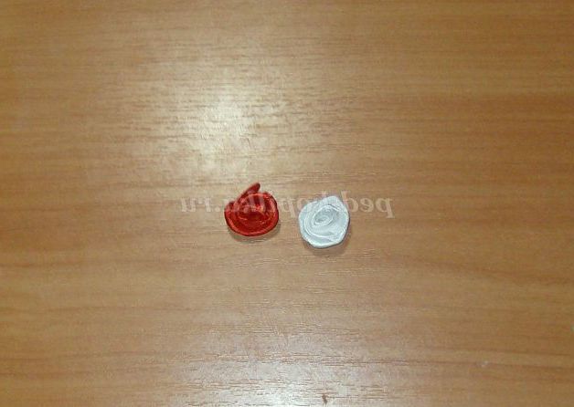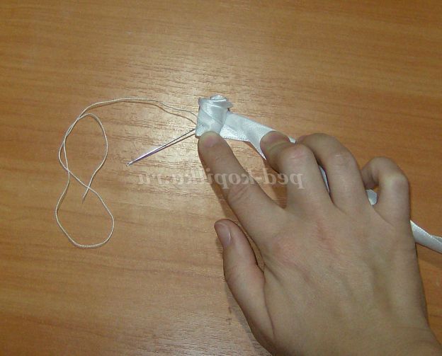 Приступаємо до виготовлення атласних троянд з широкої білої і червоної стрічки. Беремо стрічку, загортаємо верхній куточок стрічки всередину до виворітній стороні і робимо кілька стібків. Потім скручуємо стрічку на кілька обертів. Звертаємо стрічку так, що лицьова сторона весь час залишається на зовнішній стороні квітки.