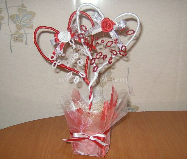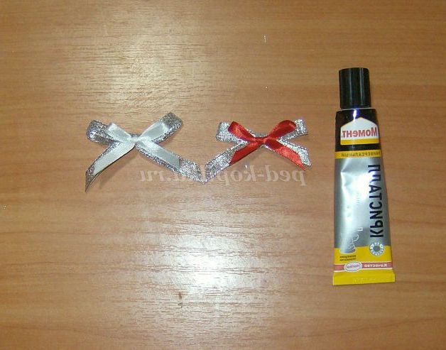 З шматочків вузьких стрічок сріблястого кольору зав'язуємо два бантика, ще по одному бантику з червоної і білої стрічки. Червоні та білі бантики повинні бути трохи менше сріблястих. Ставимо білі і червоні бантики на верх сріблястих і приклеюємо. Отримані двошарові бантики прикріплюємо до центру (до місця загину) сердечок: на біле сердечко - білий бантик, на червоне сердечко - червоний бантик.