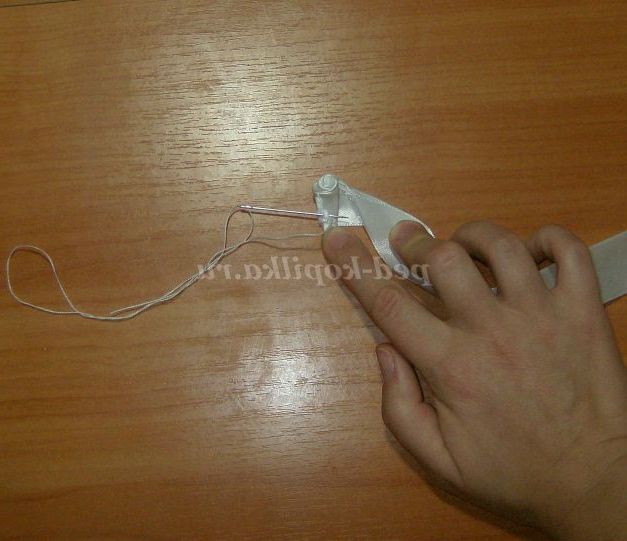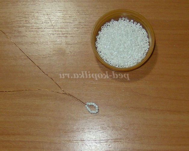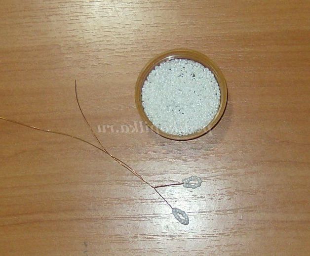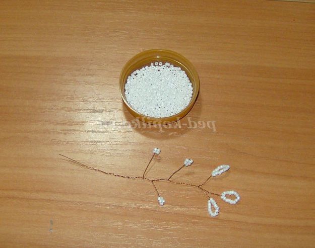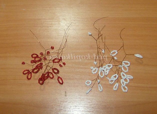 Беремо тонкий дріт і починаємо виготовлення гілочок з білих і червоних бісеринок. Технологія формування гілочок багатьом відома. На тонкий дріт надягаємо 15 штук бісеринок. Ставимо їх посередині дроту скручуємо кілька разів. Отже, продовжуємо надягати по 15 , 13 і 5 штук бісеринок і закручувати в шаховому порядку. Таким чином, виготовляємо по 4 гілки з білих і червоних бісеринок.