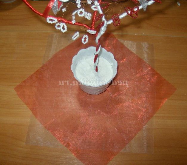 Після повного висихання алебастру, ємність, поставивши на середину квадратних шматочків білого і червоного капрону, загортаємо. Зав'язуємо на середині ємності бантик з білої і червоної вузької стрічки.
