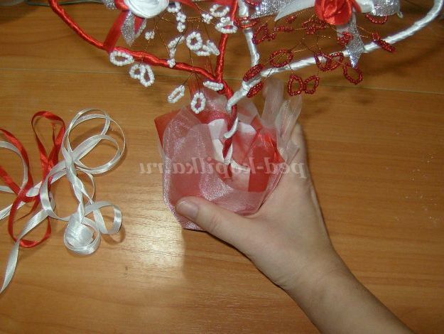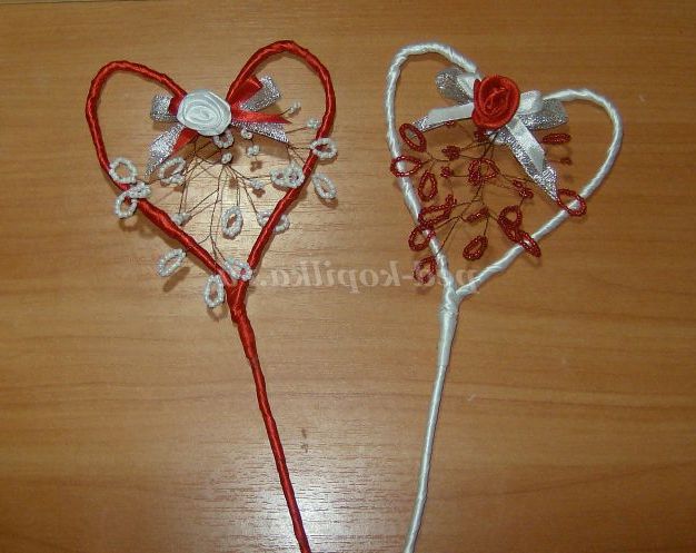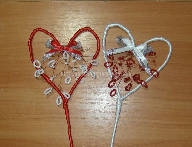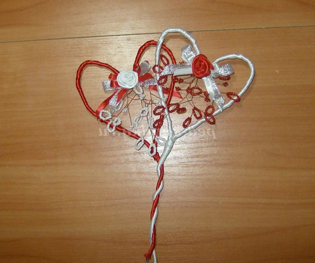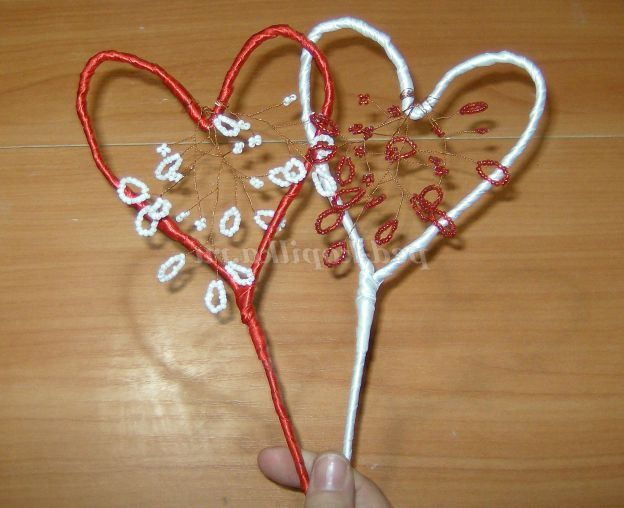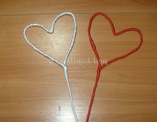 Беремо вузькі стрічки білого і червоного кольору, обмотуємо ними дроту: одну - білою стрічкою, іншу - червоною. Починаємо обмотувати знизу (з прямого кінця) дроту, поступово переходячи до сердечку. Місце стику «закриваємо» стрічкою.