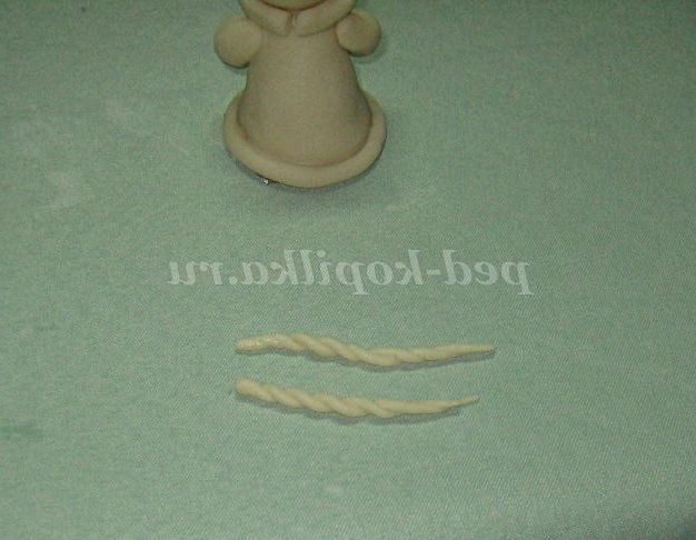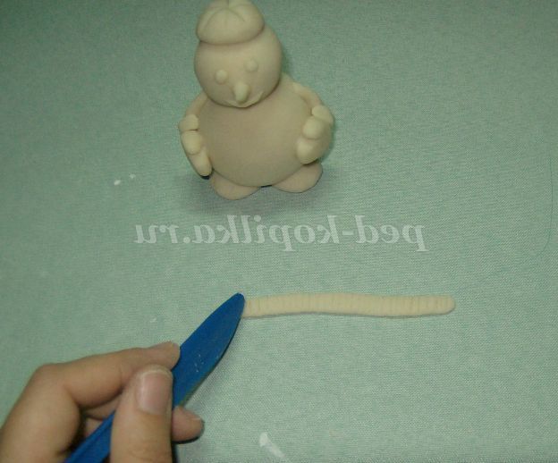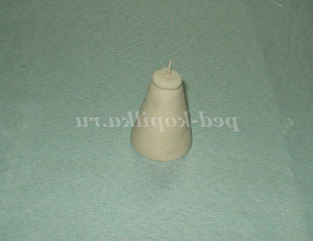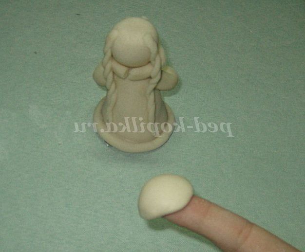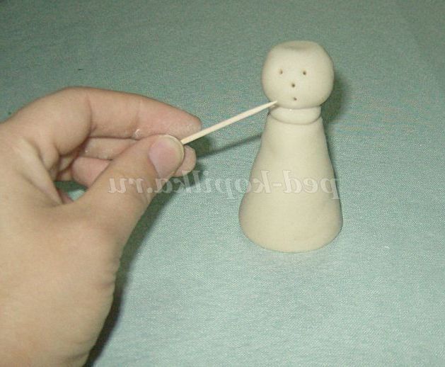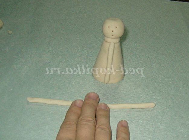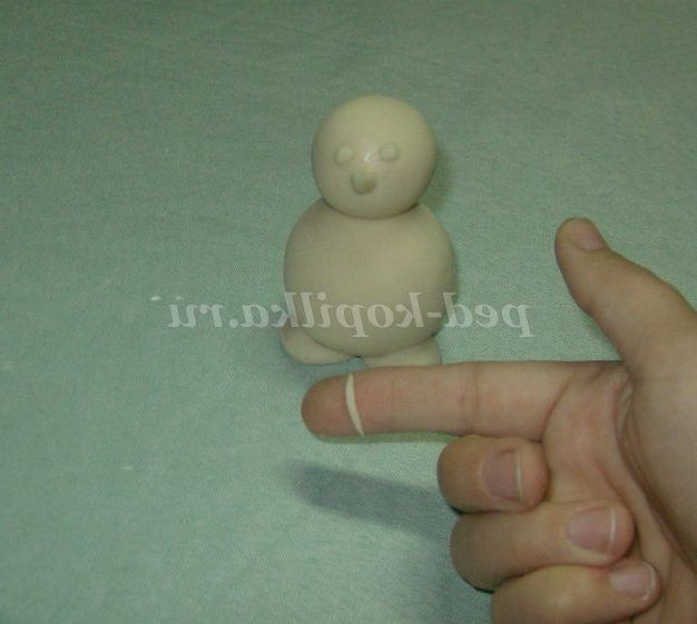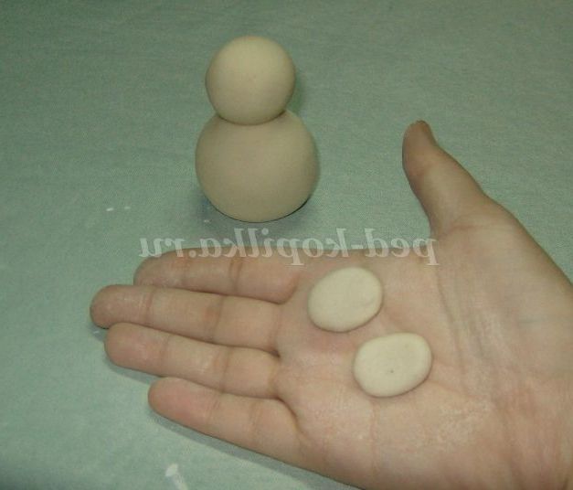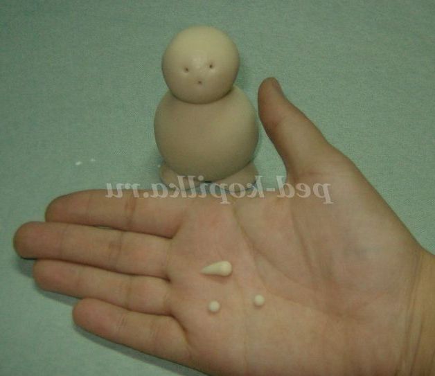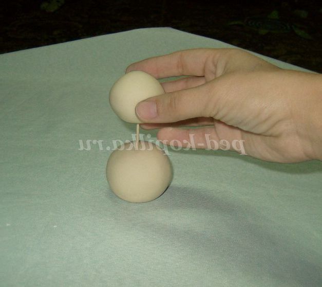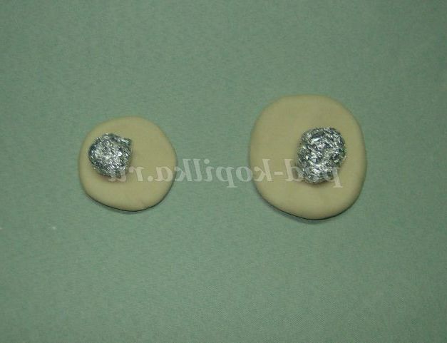 Скачаємо дві кульки: один великий (для тіла), інший поменше (для голови). Сплющує їх пальчиками, ставимо на них зім'яті шматки фольги у формі кулі (великий і маленький). Залишаючи фольгу всередині тіста, знову скачаємо дві кулі-колобка. За допомогою зубочистки ці кульки з'єднуємо. Перш ніж на великий куля прикріпити маленький, на місце з'єднання наносимо клей ПВА.