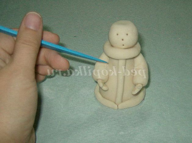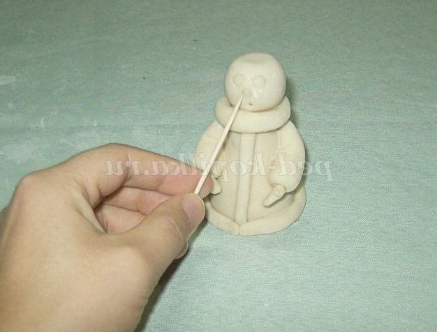 Остання деталь: скачаємо дві кульки, сплющує їх і, трохи придавлюючи, прикріплюємо до тулуба Сніговика. Зубочисткою робимо на них по 4 заглиблення-дірочки. Таким чином, формуємо два ґудзики.