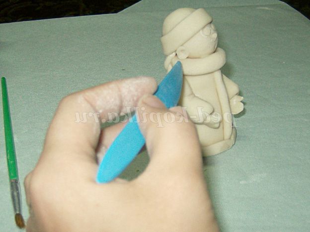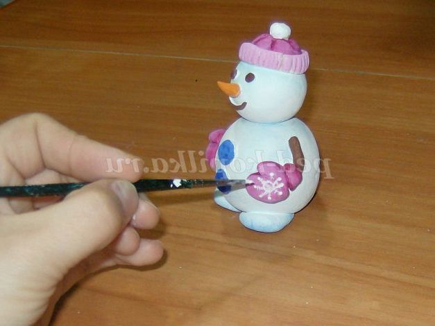 Білою фарбою розмальовуємо шапочку, рукавички. На рукавицях малюємо сніжинки. Помпон і манжету шапочки теж пофарбуємо білою фарбою.