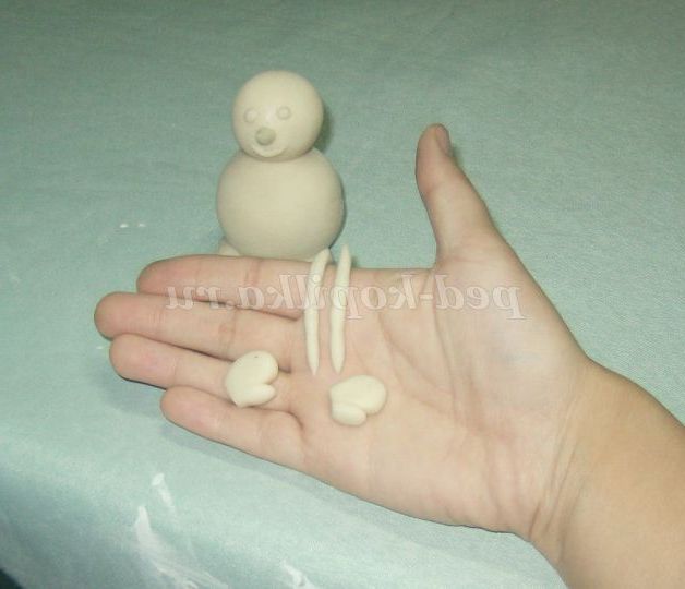 Скачаємо дві тонкі ковбаски для рук, дві рукавички-коржики. Наносив клей на місце з'єднання, прикріплюємо їх до тіла. З двох кульок формуємо манжети.