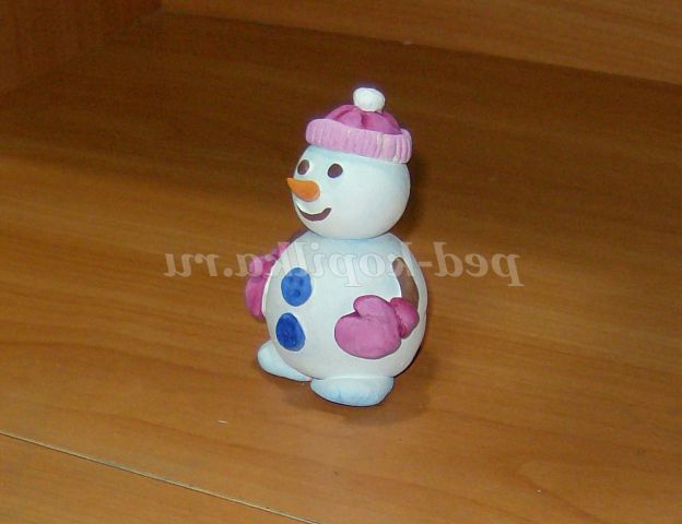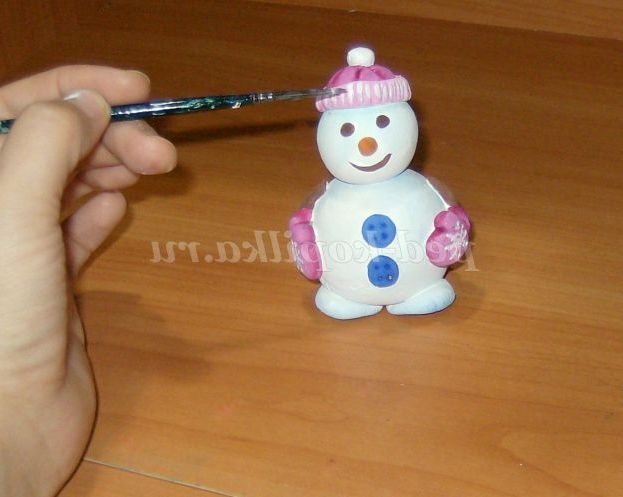 З шматочків тіста скачаємо маленькі кульки для очей, крапельку для носа. Змочивши позначені місця клеєм, прикріплюємо їх. При з'єднанні носі надаємо форму морквини. Для ротика зліпимо джгутик, трохи изогнем його дугою догори і прикріплюємо на обличчя Сніговика.
