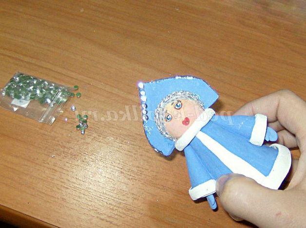 Продовжуємо розфарбовування Снігуроньки. Спереду на голову дуже акуратно приклеюємо шматочок мережива. Декоруємо мережива паєтками. На корону і бантик наносимо блискучий лак для нігтів, а на лак сиплемо блискітки. По краях корони приклеюємо паєтки-камінчики, які «горять» як алмази. Шубу, рукавиці теж прикрашаємо.
