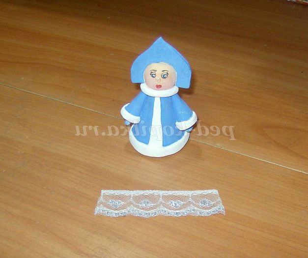 Основна фігура Снігуроньки готова. Приступаємо до прикраси голови. Робимо корону, скачуємо ковбаску для коміра. Корону приклеюємо на голову, комір - на шию.