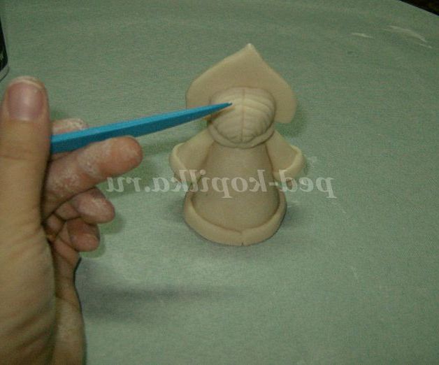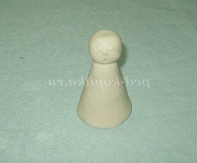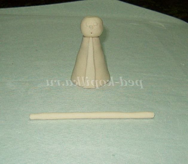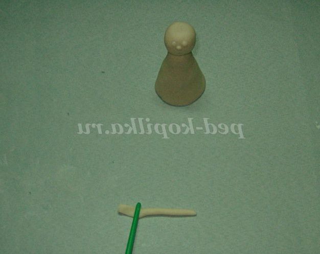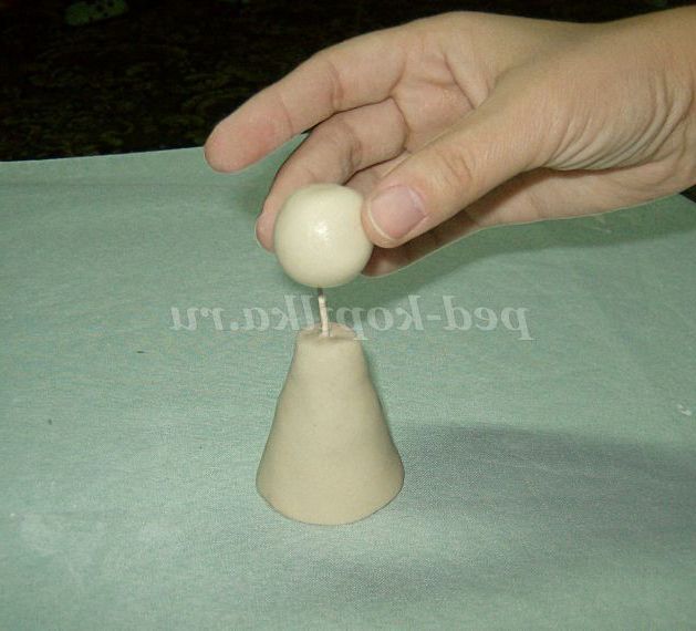 Знову нащипываем шматочок тіста, скачаємо кулька - голівку і за допомогою зубочистки з'єднуємо «голівку» з «тілом». Місце з'єднання зволожуємо клеєм ПВА.