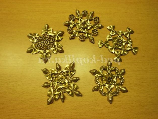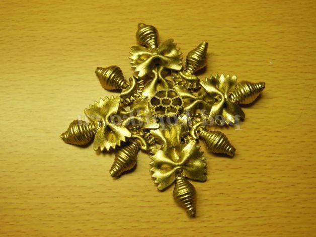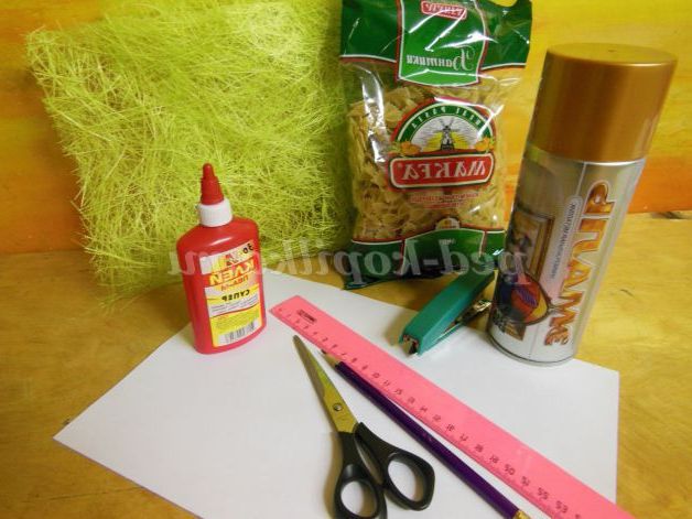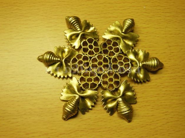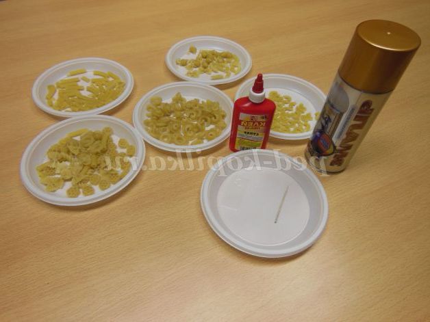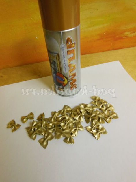 1. Попередньо фарбуємо макаронні вироби аерозольною фарбою "під золото". Краще це зробити без участі дітей. Не забуваємо про техніку безпеки при роботі з горючими матеріалами. Розкладаємо макаронні вироби на газеті в один шар, стежимо, щоб макарони не перекривали один одного. Фарбу попередньо добре збовтуємо. Потім, в кілька етапів розпилюємо фарбу: спочатку вертикально, потім під невеликим кутом з усіх боків. Фарба висихає протягом години.