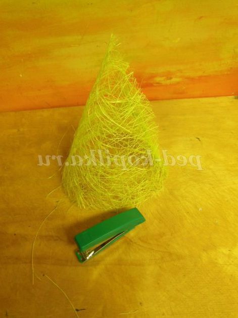 6. Звертаємо заготівлю конусом і зрізи з'єднуємо степлером. Можна використовувати більш складний варіант з'єднання зрізів - висмикнути нитку з сизалю, втягати в голку з великим вушком і зшити зрізи.