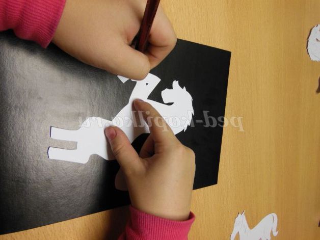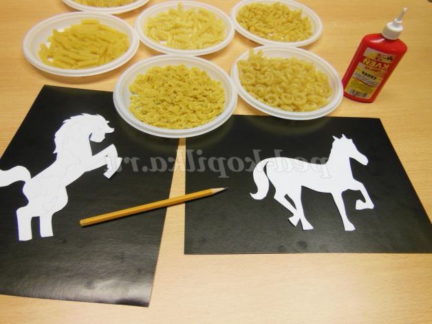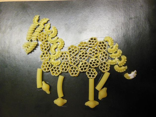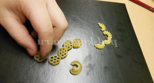 2. Заповнюємо малюнок коня макаронними виробами, використовуючи різні види макаронів. Тут все залежить від фантазії - ми прямими макаронами викладали ноги, а круглими і хвилястими - тулуб, хвіст, гриву, черепашками - копита. Стежимо, щоб макарони не виходили за контур малюнка. Для отримання макаронів потрібного розміру - їх можна розрізати ножем на дощечці. Так ми зменшували прямі макарони для ніг, від черепашок відрізали кінці - виходили вуха.