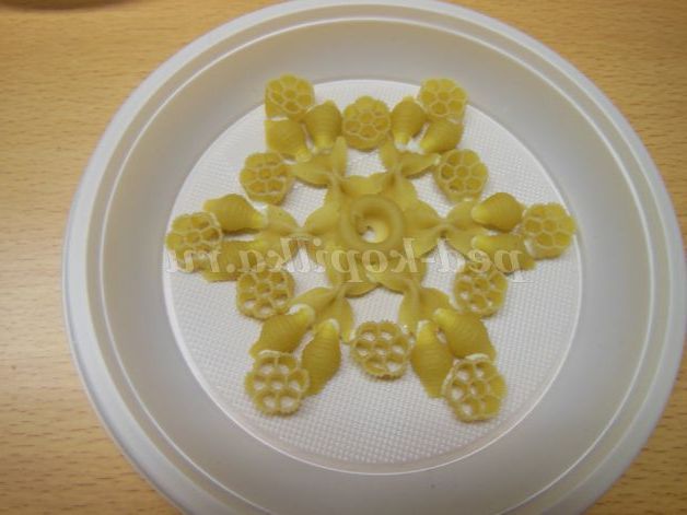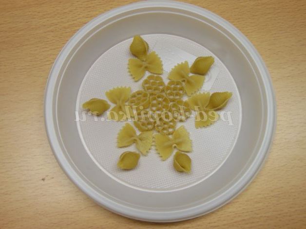 1. Сніжинки зручно робити на одноразових пластикових тарілочках - зручно збирати сніжинку, склеювати і переносити, готова сніжинка добре открепляется від пластику. На тарілочці викладаємо сніжинку з макаронних виробів різної форми за власним задумом.