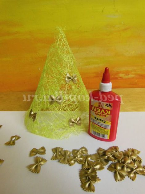 7. Прикрашаємо ялинку макаронними виробами. Приклеюємо макарони на клей ПВА - макарони з непокрашенной боку змащуємо клеєм і даємо клею підсохнути, потім приклеюємо до ялинки.