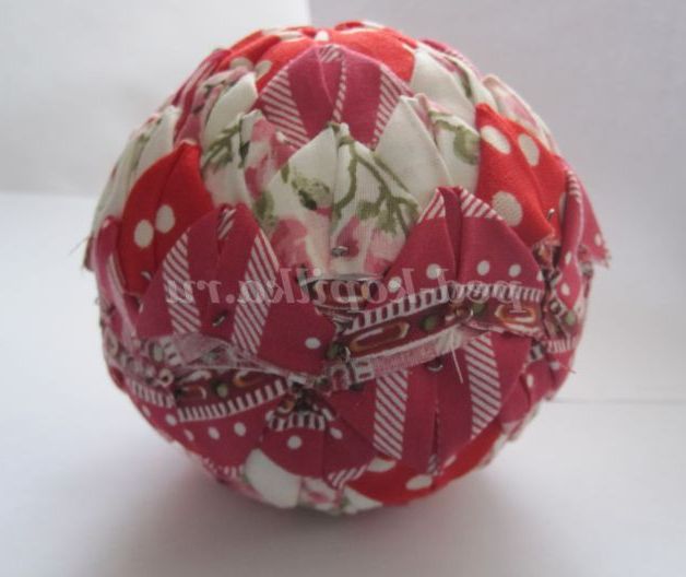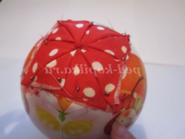 I етап Беремо наш м'ячик знаходимо у нього верхушечку (те місце з якого ми почнемо працювати) накладаємо на нього клаптик і закріплюємо голочками.