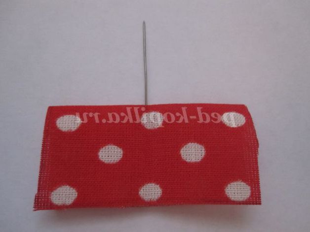 ІІ етап. Клаптевий квадратик складаємо навпіл і протикаємо приблизно в серединку голочку (голочку пронизуємо з внутрішньої сторони на лицеву)