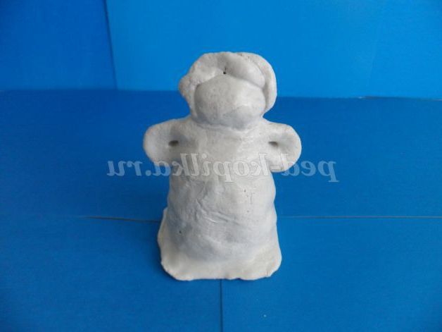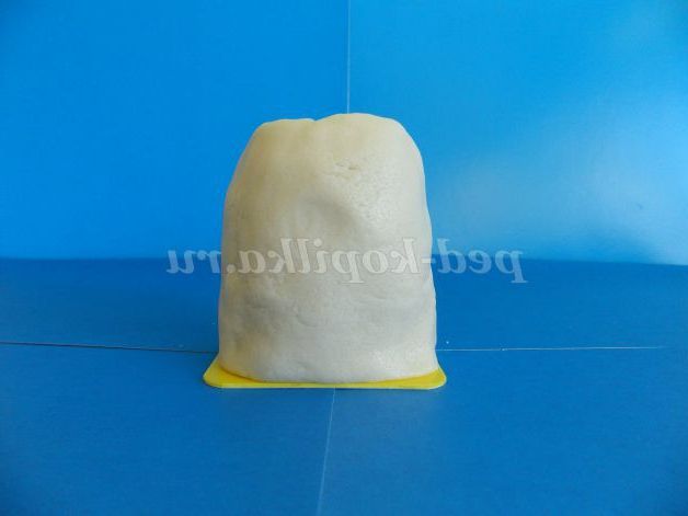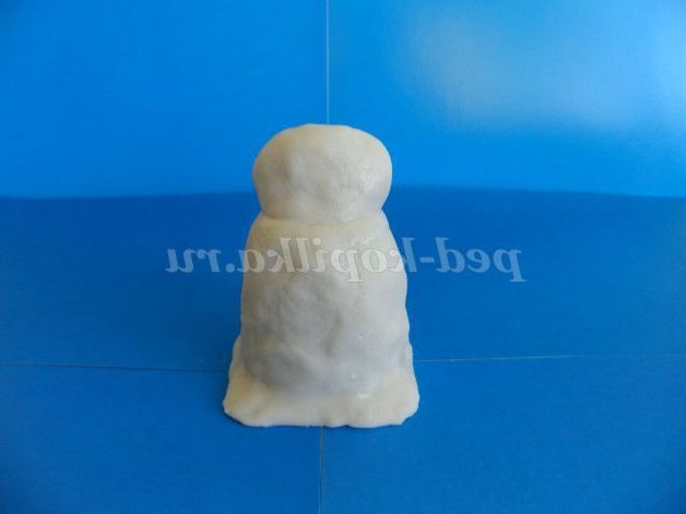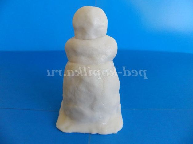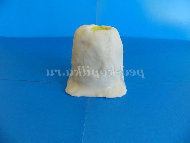 Коли тісто готове, можна приступати до виготовлення фігурки Дымковской панянки. Беремо, пластмасовий стаканчик, накладаємо на нього шматочок сплющенного тіста, розгладжуємо пальцем, щоб тісто лягло на весь стаканчик.