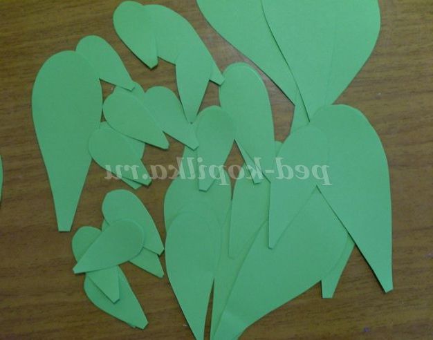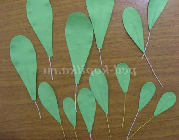 10. З зеленого паперу вирізаємо листя різного розміру. Склеюємо їх попарно, фіксуючи між ними шматочок дроту.