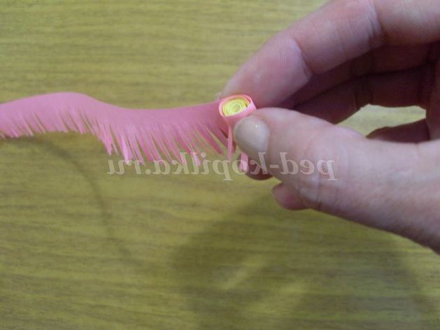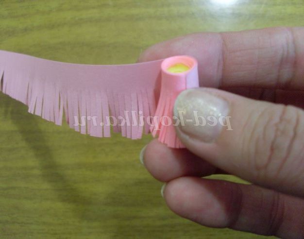 5.Присоединяем клеєм світло-рожеву смужку паперу до жовтої заготівлі і продовжуємо скручувати. Намагайтеся накладати шар за шаром туго і рівно.