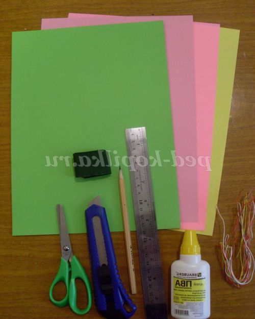 - папір для квілінгу (жовтого, зеленого і 2 відтінки рожевого кольору) або кольоровий офісний папір, гофрований папір зеленого кольору,