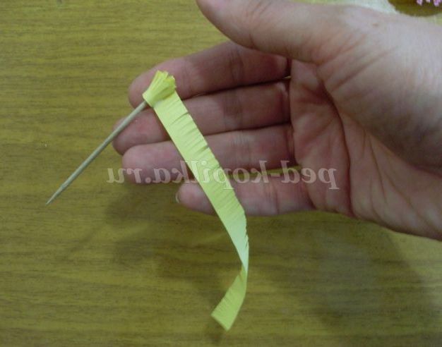 4. Скручуємо за допомогою зубочистки з жовтої смужки тугу скручування. Акуратно витягуємо зубочистку, не порушуючи скрутки і фіксуємо край клеєм.