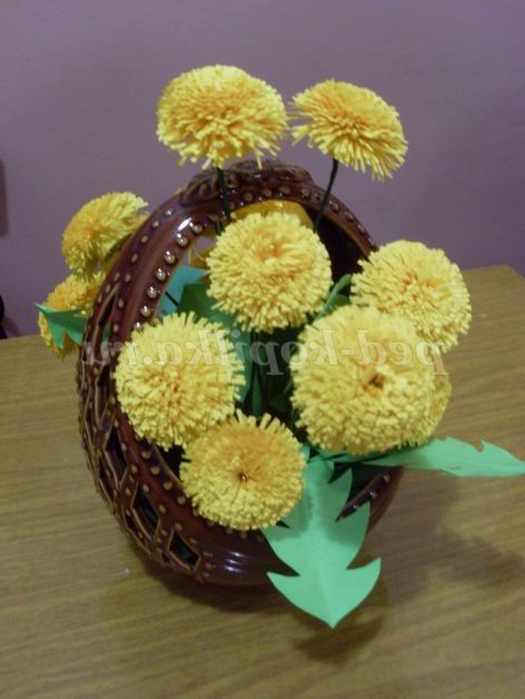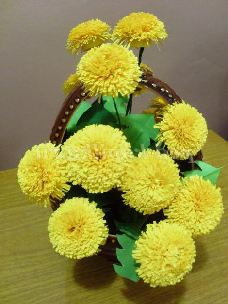 Я зібрала свій букет з 7 маргариток. І ось що у мене вийшло. Сподіваюся, що зуміла надихнути вас на даний вид творчості, бо папір дуже простий в роботі і доступний матеріал, а результат радує. Аналогічно ми з дітьми на занятті виготовили букет кульбаб