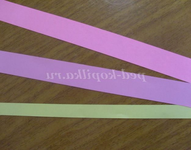 2. Наріжемо з кольорового паперу смужки (жовті -1,5 см, рожеві-2 см). На виготовлення однієї квітки потрібно 1 жовта, 1 світло-рожева і 3 темно-рожеві смужки.