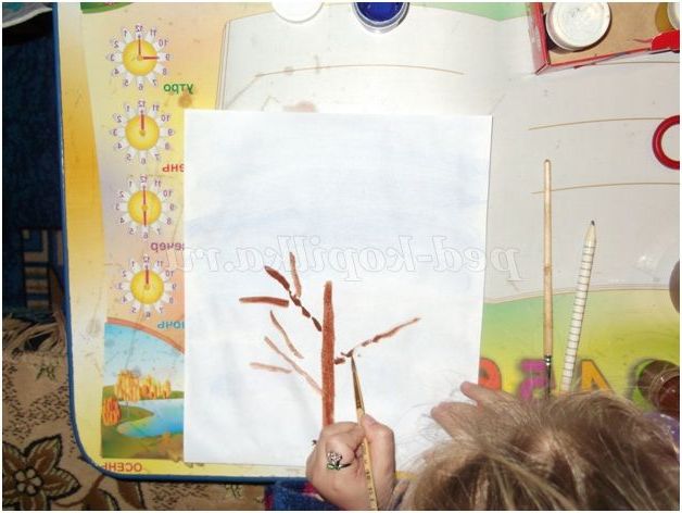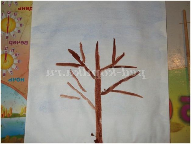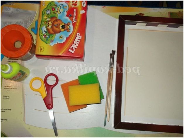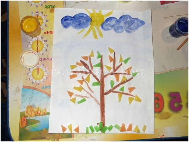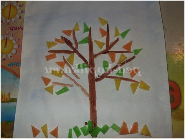3.Потом з кольорового поролону вирізати «листочки» для нашого дерева і приклеїти на дерево» листочки, рівномірно наносячи клей.