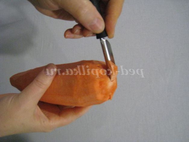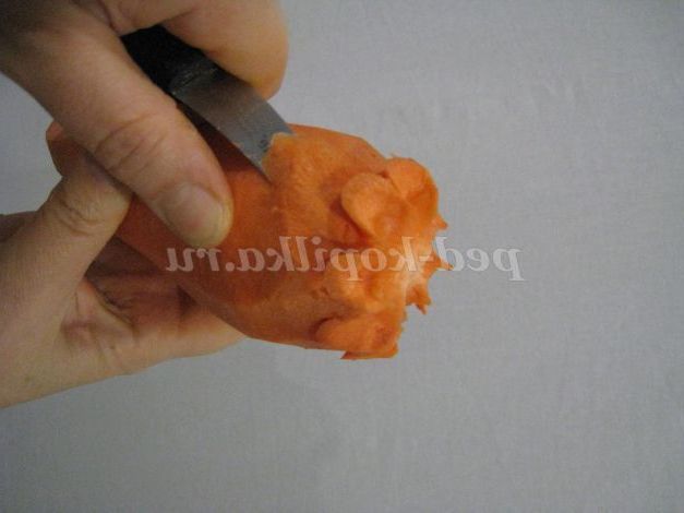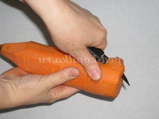 Беремо велику моркву, миємо, чистимо, сушимо. Мокрі овочі ковзає в руках - велика ймовірність порізатися ножем - тому обтираем морква паперовим рушником.