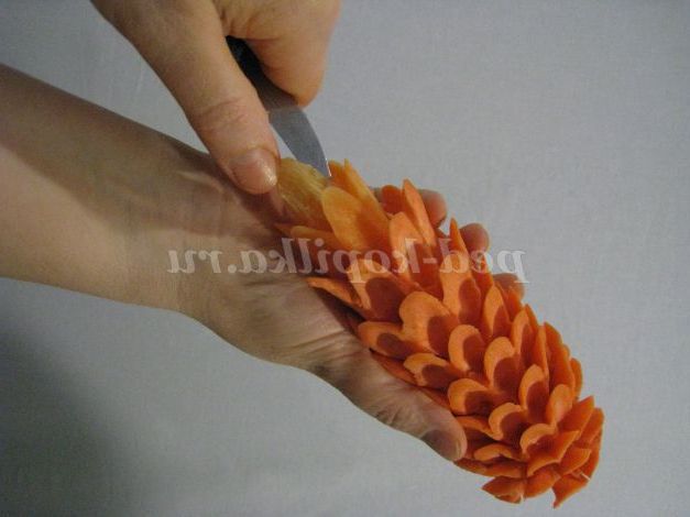 Як бачите, шишки зроблені з великої моркви. Моркву можна замінити на дайкон (білий редис), буряк циліндричної форми - все за вашим бажанням! Ви навіть можете вирізані овочі засолити або замаринувати (тоді вирізати овочі треба не пізніше, ніж за три тижні до приходу гостей, щоб вони просолились).