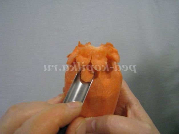 Приступаємо до другого ряду. Овальним ножем в шаховому порядку по відношенню до першого ряду починаємо робити верхню частину лусочок (все як в першому ряду), потім ріжемо самі лусочки і підрізаємо м'якоть і так до кінця