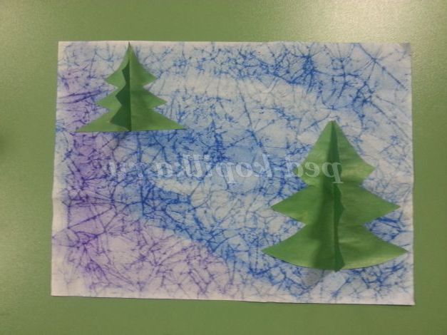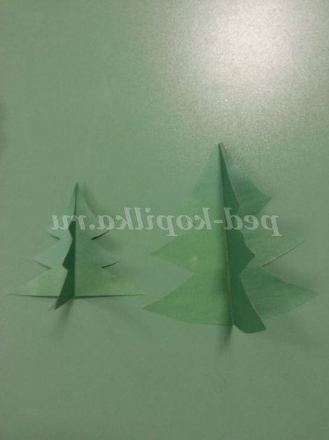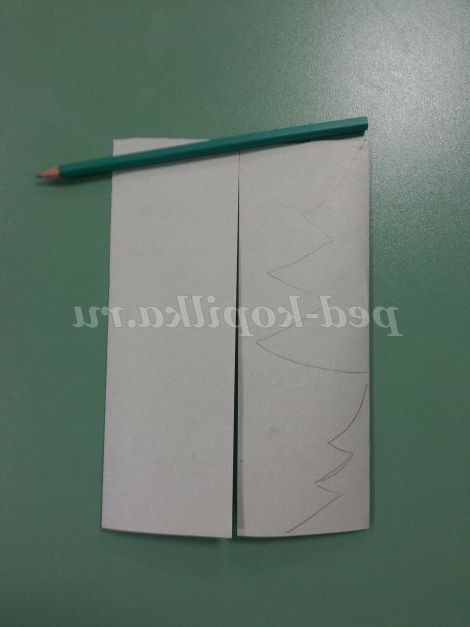 Тепер наш фон можна відкласти, що б він висох і зайнятися ялинками. Для цього нам потрібно взяти кольорову зелену папір і скласти її в двоє з двох сторін і намалювати дві ялинки одну велику, а одну трохи менше, як показано на рисунку.