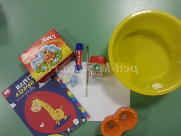 Для роботи нам знадобиться: аркуш паперу для малювання, кольоровий папір, гуаш, пензлик, тазик для замочування папери, вата (бажано блакитна), зубочистки? ножиці.