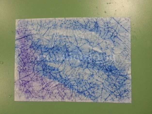 Малювати потрібно швидко. Поки папір мокра і пом'ята фарба за нею легко розтікається. Фарбу необхідно брати насиченішим і густіше, ніж зазвичай, так як в папері багато вологи. Починайте малювати зі світлих тонів, поступово просуваючись до більш темним і насиченим. Краще використовувати блакитний, синій, фіолетовий, білий.