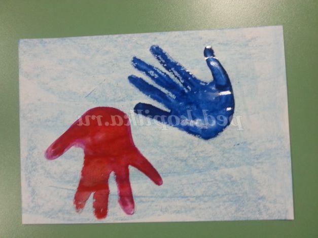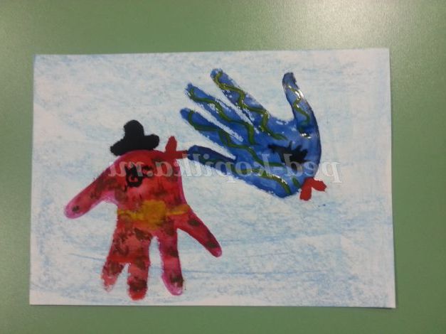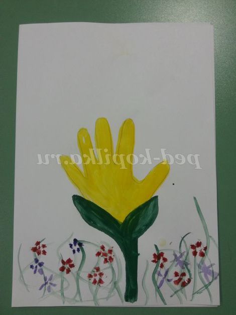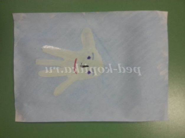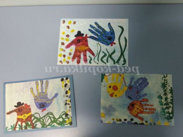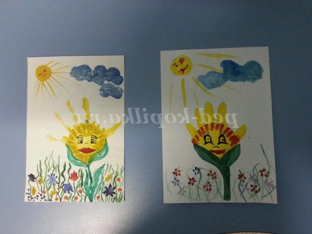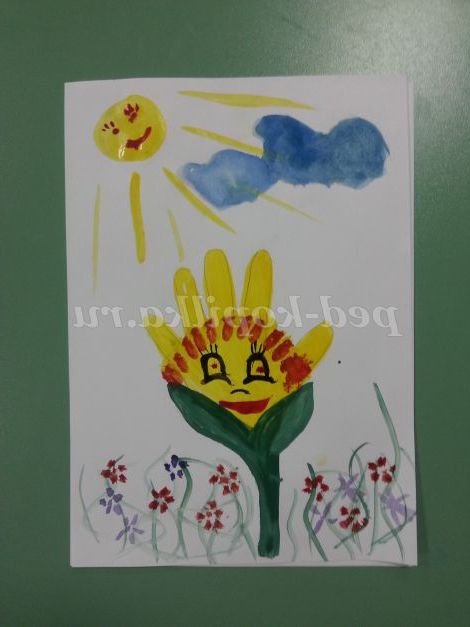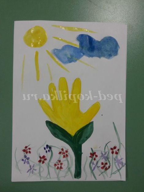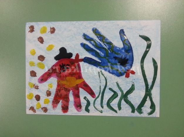 Завдання: познайомити дітей з нетрадиційною технікою малювання (долонею); вчити самостійно придумувати композицію малюнка; розвивати творчу уяву, увагу, дрібну моторику і координацію рухів рук.