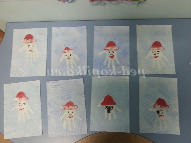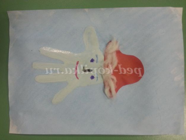 Для зображення Діда Мороза прикладаємо долоньку, обводимо її і розфарбовуємо в білий колір.